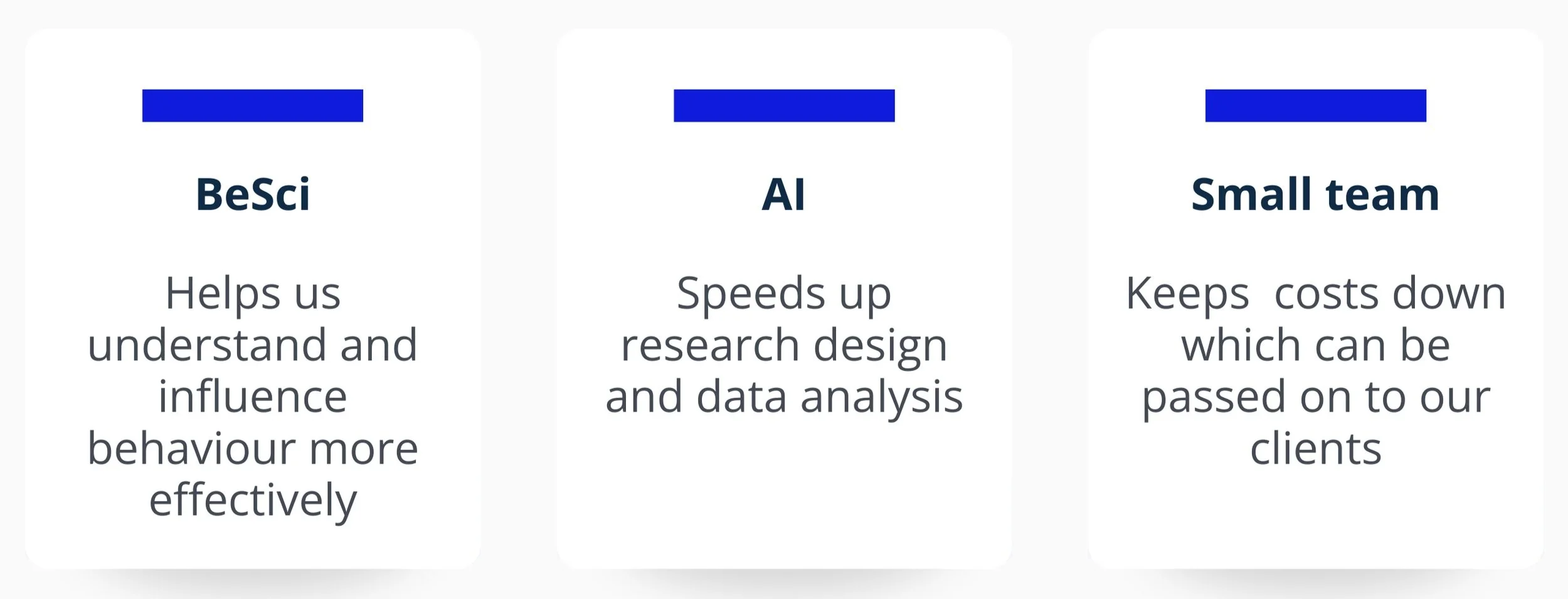 By combining behavioural science and AI with a lean team of human experts we’re able to deliver top-tier insights, without the big-agency price tag.